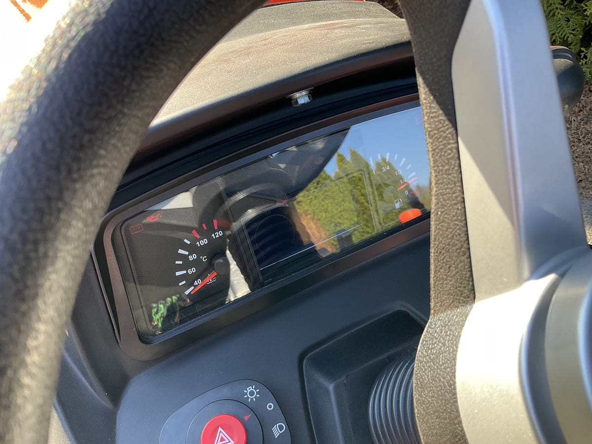 - Wszystkie wskaźniki i dźwignie sterowania (w tym sterowanie ładowaczem) są rozmieszczone ergonomicznie, zapewniając operatorowi pełną kontrolę nad maszyną bez konieczności odrywania wzroku od pracy.