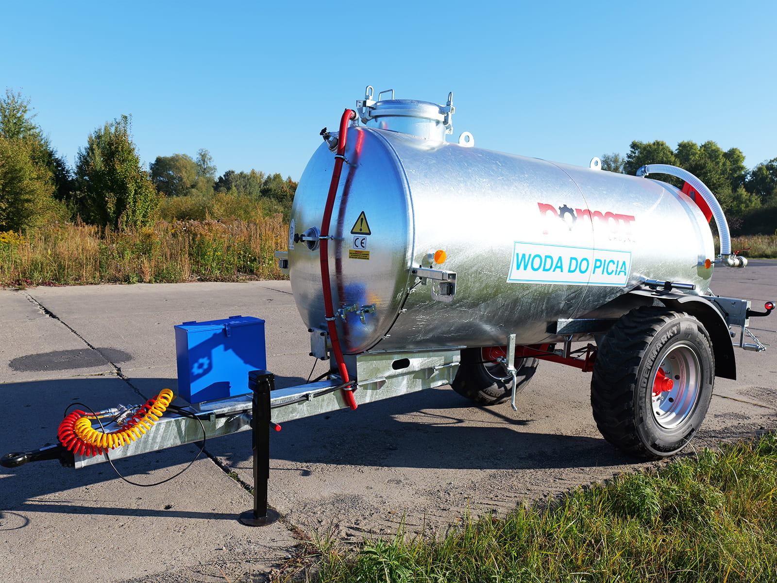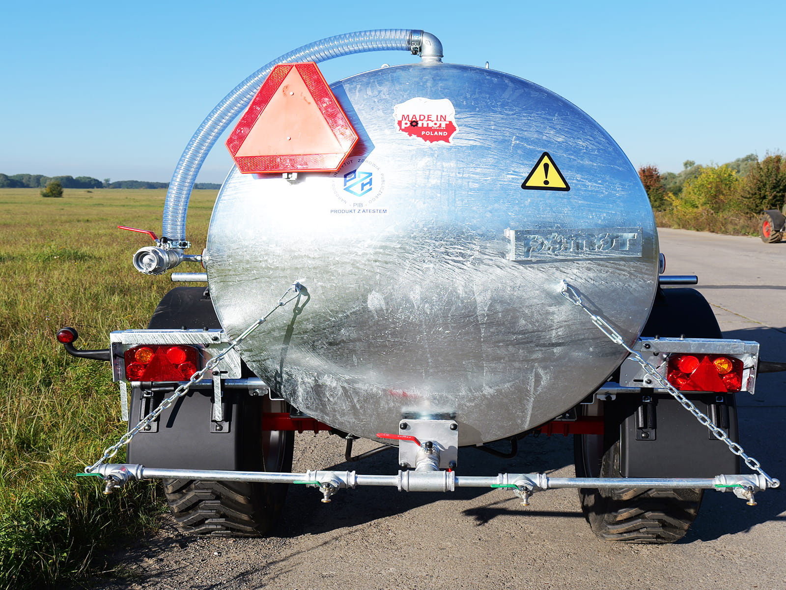 - Przyczepa jest w pełni przystosowana do ruchu drogowego (homologacja 30 km/h). Wyposażona w błotniki i czytelny piktogram "WODA DO PICIA".